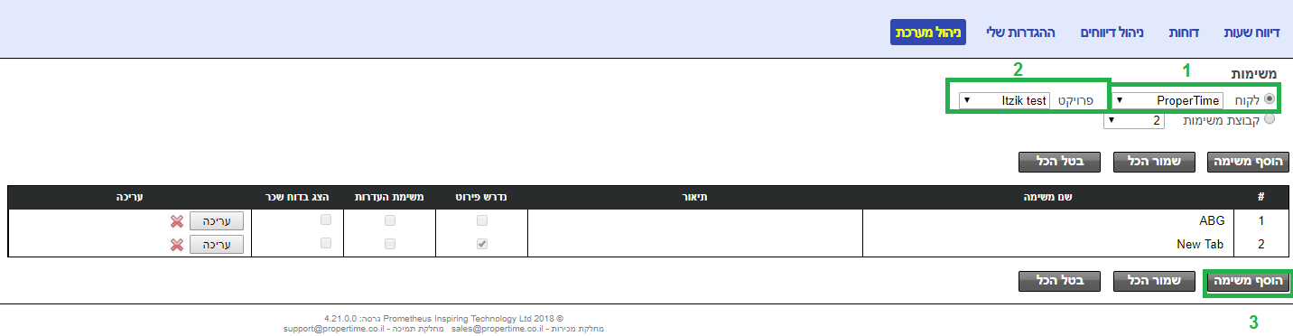 אם מדובר במשימה שלא שייכת ללקוח ופרוייקט קיימים יש להקים קודם את הלקוח והפרוייקט ואז ליצור את המשימה.