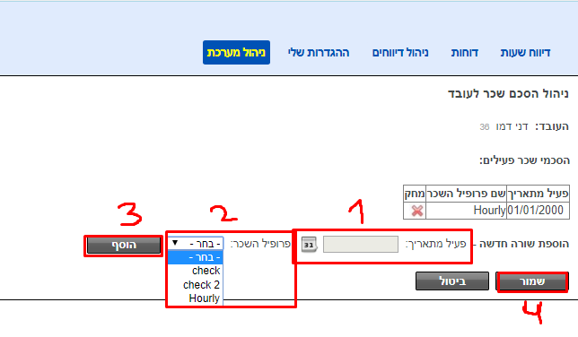 במסך זה תוכלו לעדכן לעובד הסכם שכר הרלוונטי כלפיו בביצוע מס' פעולות: