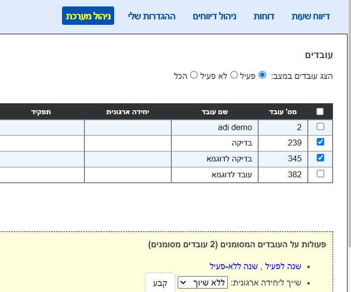 אם רוצים לשייך כמה עובדים לאותה יחידה ארגונית, ניתן לסמן אותם במסך עובדים , לבחור את שם היחידה הארגונית בשדה למטה במסך וללחוץ על "קבע",